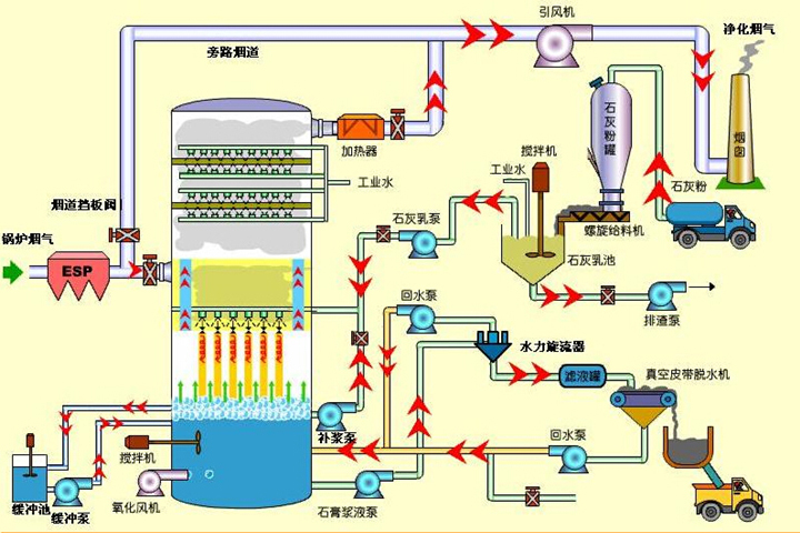 吸收塔SO2的漿液落入吸收塔底部反應槽,通過脫硫循環泵與補充的石灰石漿液再次從吸收塔上的噴淋系統噴出,洗滌煙氣中的SO2。混合漿液在反應槽內由外置的氧化風機供給空氣使亞硫酸根氧化成石膏 。