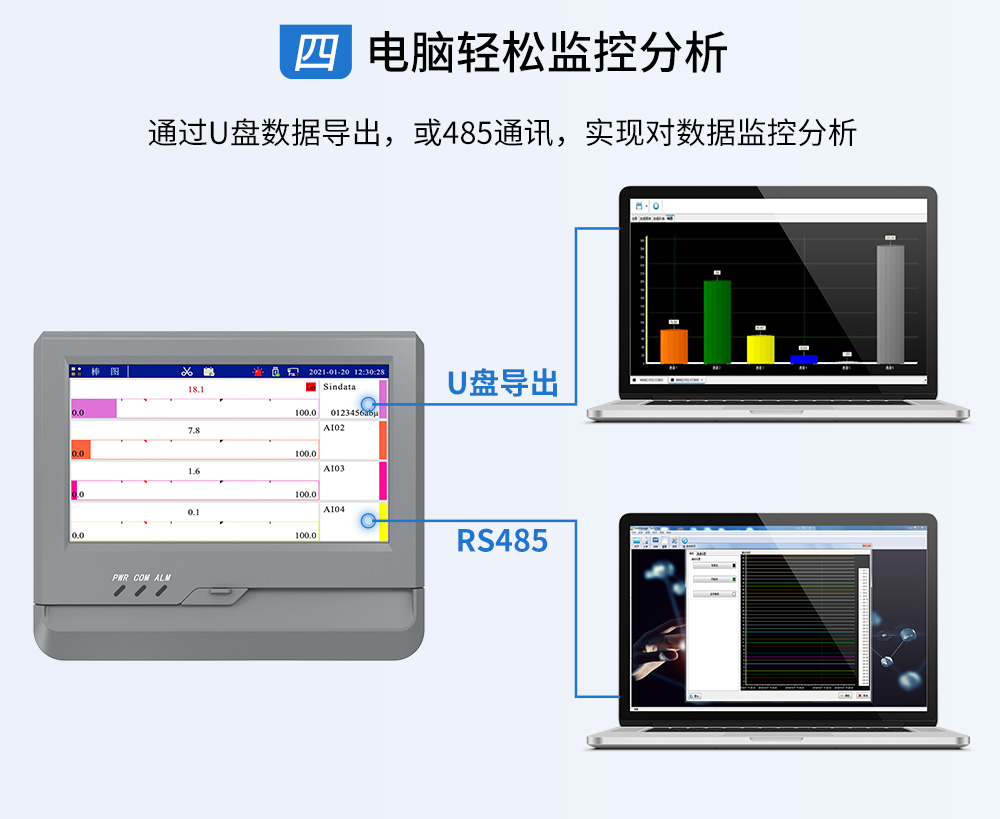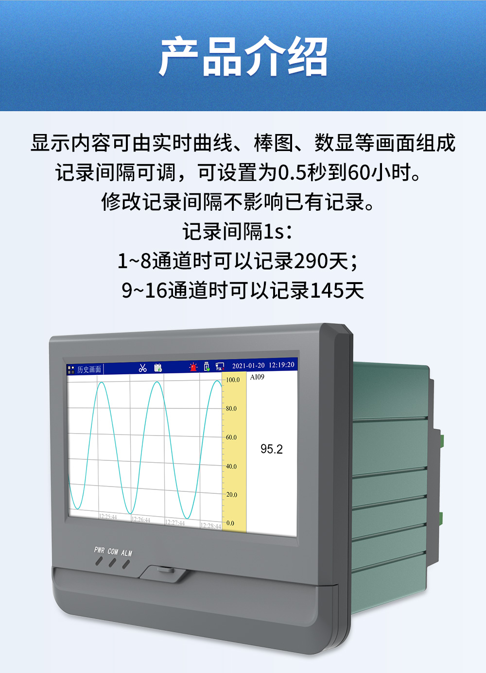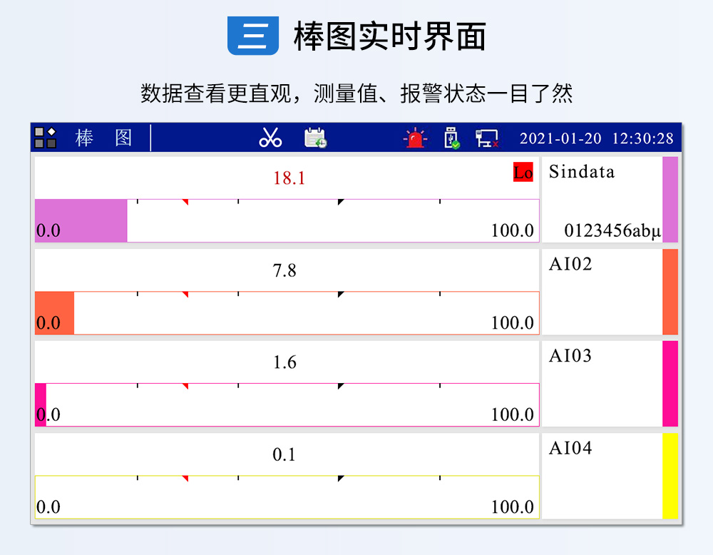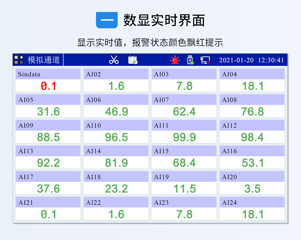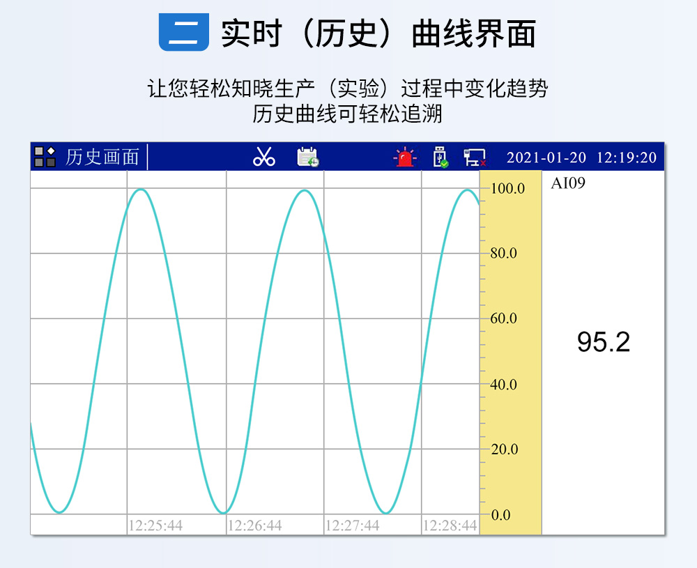 觸摸式彩色無(wú)紙記錄儀具有 60 個(gè)運(yùn)算函數(shù)、24 路模擬量輸入、3 路 開(kāi)關(guān)量輸入、3 路脈沖量輸入、6 路模擬量變送輸出、16 路開(kāi)關(guān)量輸出, 可實(shí)現(xiàn)運(yùn)算、顯示、記錄、報(bào)警、分析統(tǒng)計(jì)報(bào)表、高速采樣等功能,通 過(guò) RS-232/RS-485 和以太網(wǎng)通訊接口,可實(shí)現(xiàn)遠(yuǎn)程實(shí)時(shí)監(jiān)控、組態(tài)管理、 歷史數(shù)據(jù)讀取等功能,通過(guò) U 盤(pán)可實(shí)現(xiàn)組態(tài)管理、監(jiān)控畫(huà)面管理和歷史 數(shù)據(jù)管理等功能。