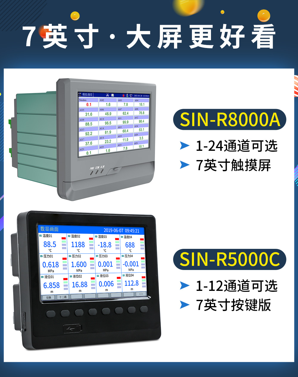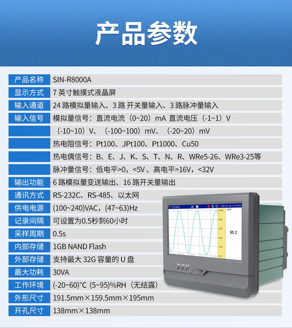 聯(lián)測(cè)儀表SIN-R8000A觸摸屏7英寸無(wú)紙記錄儀0.5S高速采集1-24路可選