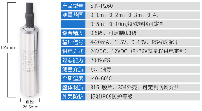 SIN-P260投入式液位變送器SIN-P260投入式液位變送器由高性能擴散硅壓阻式壓力傳感器作為測量元件,把與液位深度成正比的液體靜壓力準確測量出來,并經過信號調理電路轉換成標準(電流或電壓)信號輸出,建立起輸出信號與液體深度的線性對應關系,實現對液體深度的測量。產品精度高、體積小,直接投入液體中,即可測量出變送器末端到液面的液體高度,使用方便。適用于石油、化工、電廠、城市供水、水文勘探領域的液位測量與控制。經過長期老化及穩定性篩選,產品性能穩定可靠,能夠適用應用于環境比較惡劣的露天現場,同時能夠現場液位顯示,零點,滿程可遷移。